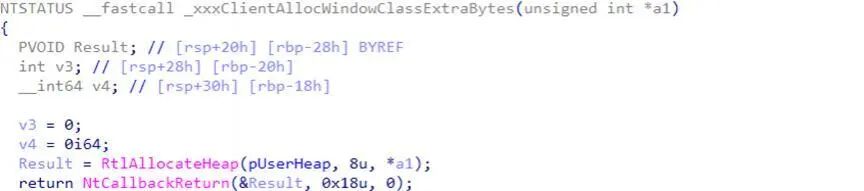 如果cbWndExtra不为0,则将其作为参数传入xxxClientAllocWindowClassExtraBytes,在xxxClientAllocWindowClassExtraBytes中通过KeUserModeCallback进入到R3,最后调用RtlAllocateHeap为其在用户层的桌面堆上申请一块内存。