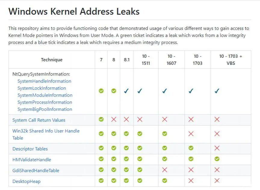 上图是对Windows内核地址泄漏的总结(来自GitHub),表格中包含截止目前泄漏内核对象的各种技巧。下面也是拿两个demo来阐述内核对象泄露的细节: