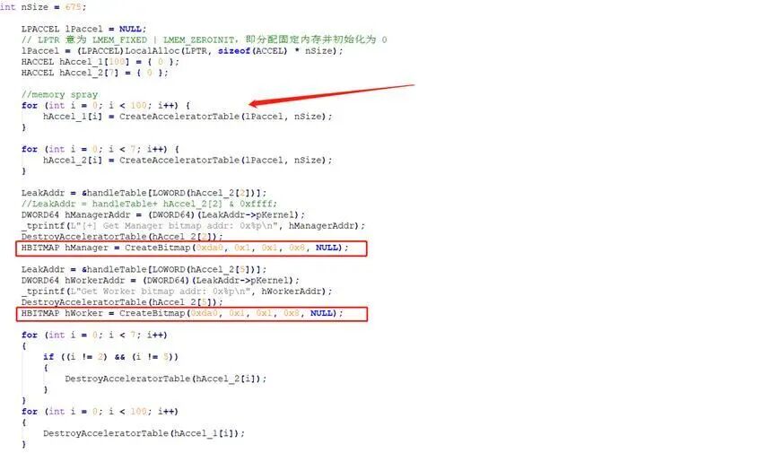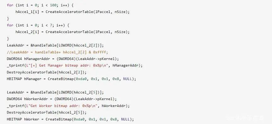 通过1)、2)我们肯定可以想到通过内存分水技术去泄露bitmap内核对象的地址,经笔者分析得出可以控制CreateAcceleratorTable 的参数,来控制其到内核所申请内存的大小。