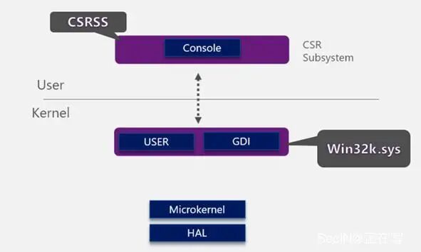 编写是完全建立的用户层上的,但是微软在 Windows NT 4.0 的改变中将 Win32k.sys 作为改变的一部分而引入,用以提升图形绘制性能并减少 Windows 应用程序的内存需求。窗口管理器(User)和图形设备接口(GDI)在极大程度上被移出客户端/服务端运行时子系统(CSRSS)并被落实在它自身的一个内核模块中。