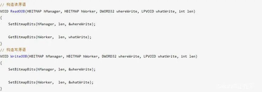 – 构造对内核任意地址的RW原语(GetBitmapBits/SetBitmapBits)