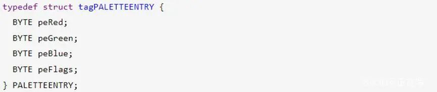 结构体 PALETTEENTRY 大小为 4 字节,其各个成员用于定义调色板表项对应的 24 位 RGB 颜色值等信息