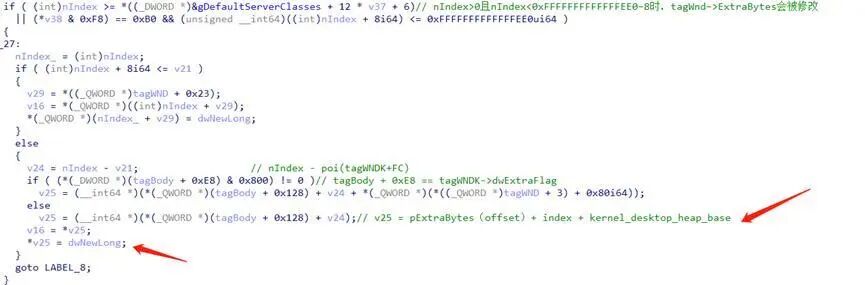 对于SetWindowLongPtr函数,最重要的就是其对Wnd的修改能力,下图xxxSetWindowLongPtr函数的部分反汇编代码,可以看到当dwExtraFlag被设置为800后,可以直接对位于内核桌面堆的pExtraBytes+Index处的数据进行修改。