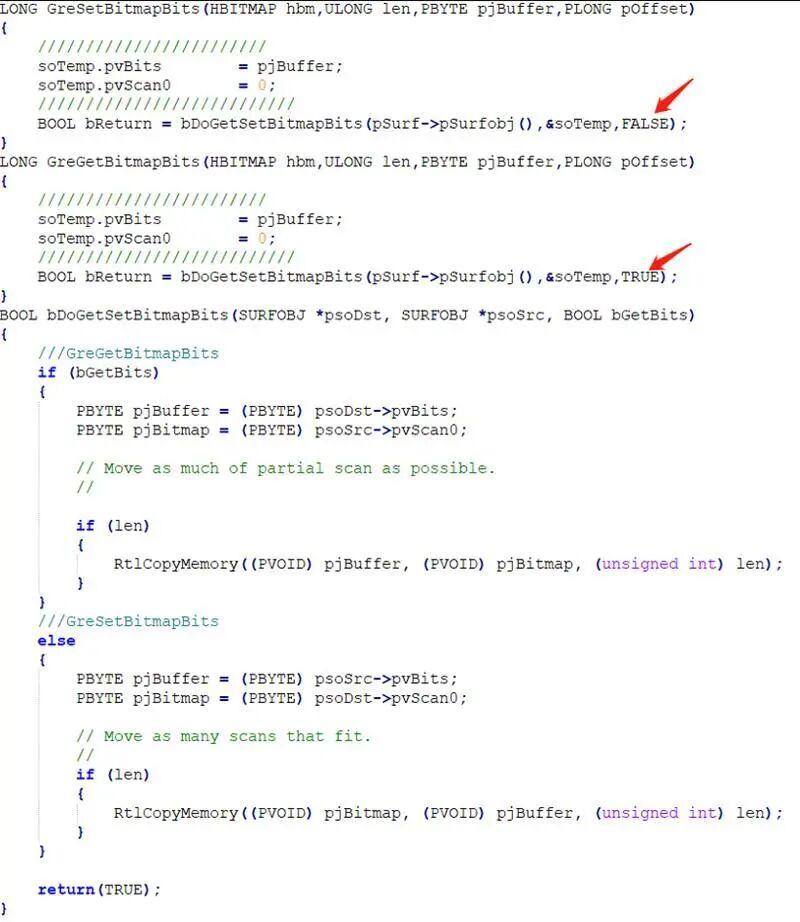 – Bitmap系列:SetBitmapBits/GetBitmapBits可对内核对象bitmap的pvScan0指向的像素数据内存进行修改。