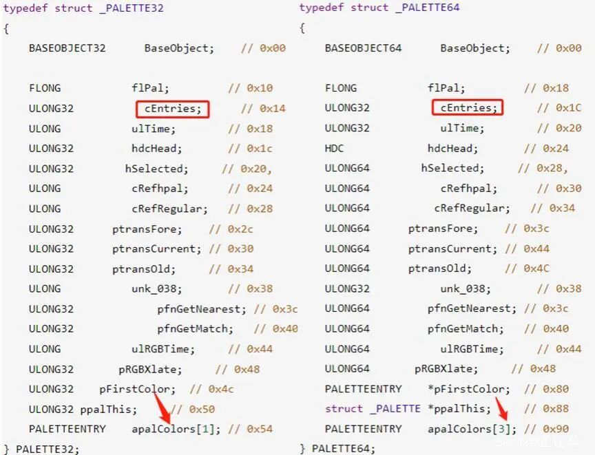 在第三章节介绍过另一个用于WWW漏洞利用的内核对象—Palette,它和bitmap有着异曲同工之妙,palette对象的0x90处是一个4字节的数组apalColors,相当于BitMap里的pixel data,pFirstColor是一个指针,指向apalColors,相当于BitMap里的pvScan0。