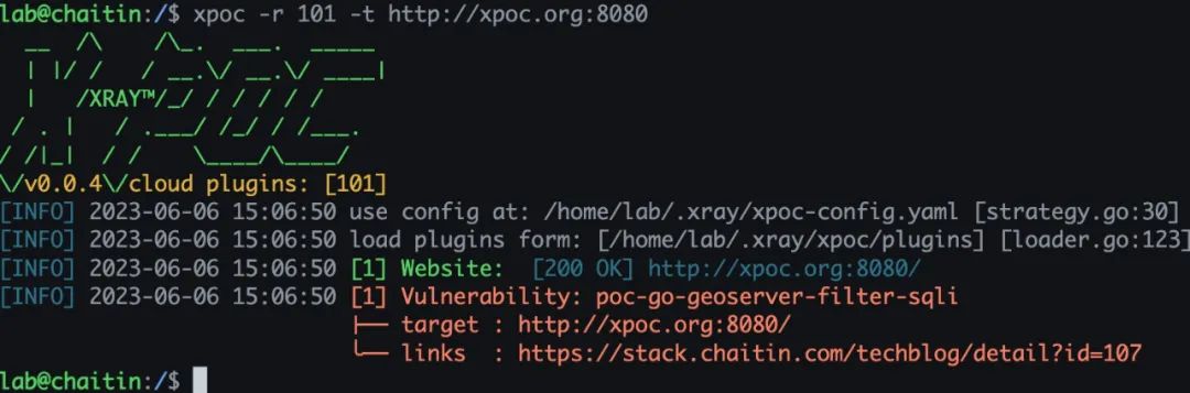 检测方法:./geoserver_sqli_cve_2023_25157_scanner_linux_amd64 scan –output result.json