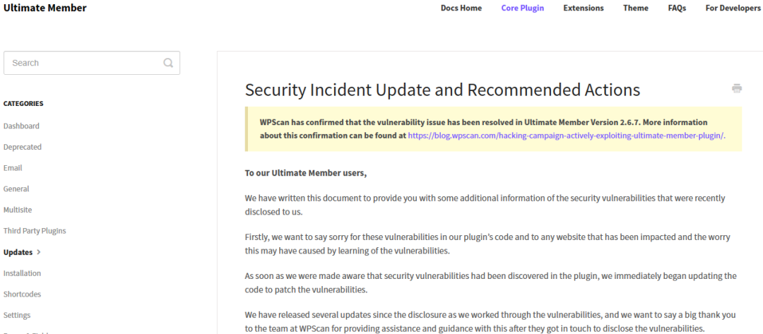 作为对此漏洞的回应,Ultimate Member插件的开发者立即发布了一个新版本2.6.4,然而仍然存在绕过此补丁的方式,漏洞仍能够被利用。在之后发布的2.6.7版本中,此问题终于得到完全的修复。