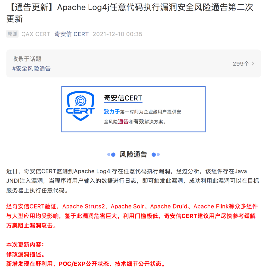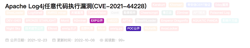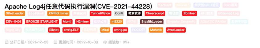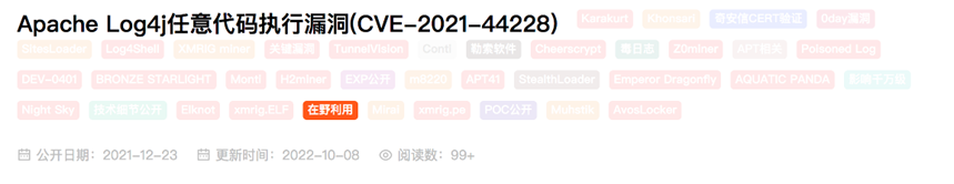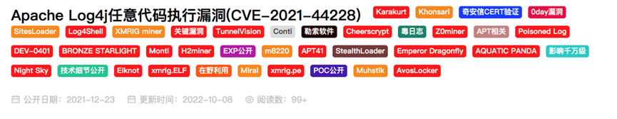 这里是我们对2021年底核弹级漏洞Apache Log4j任意代码执行漏洞(CVE-2021-44228)的标签实例,随着影响此漏洞实际风险的因素的持续迭代,这些标签会随时新增和更新。