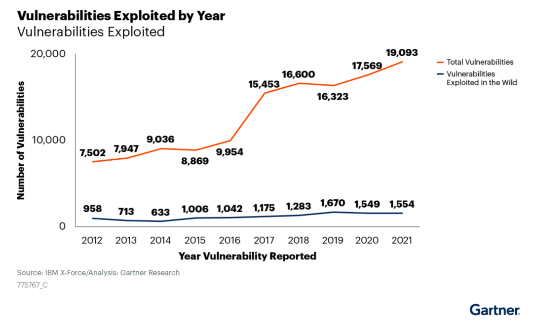这里是Gartner对漏洞管理的最新报告中数据:IBM X-Force对近10年来的漏洞被利用情况也做过一个统计。可以看到,这里的数据虽然跟我们的统计结果有些差异,但数量级是一样的千级。近年来尽管每年的漏洞数量都在创新高,但被利用的漏洞数却相当稳定,10%不到。