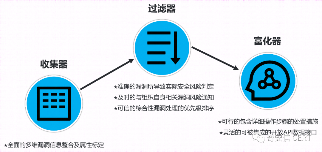 漏洞的分析过滤不仅要基于准确的技术判定,还要足够快速,这样才能抢在攻击者之前避免漏洞被利用从而导致损失,需要及时地将与组织自身相关的漏洞风险通知到用户。