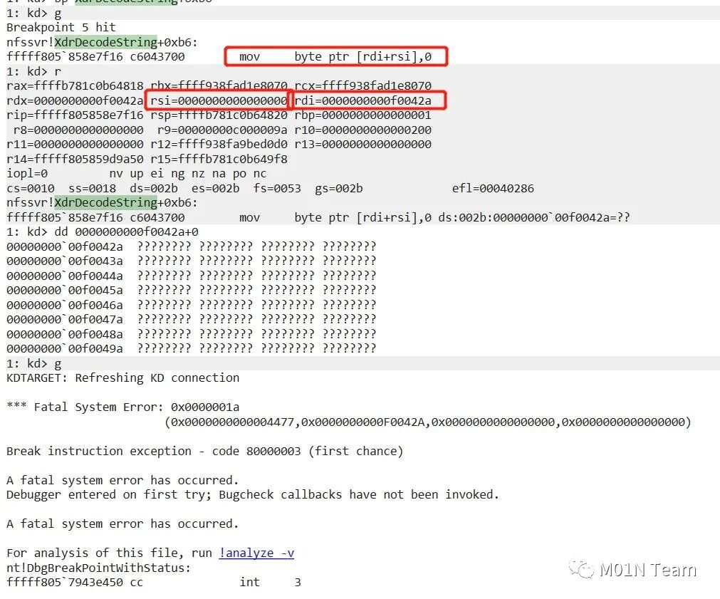 当一切正常时,ExAllocatePool2分配成功,在调用XdrDecodeString时,a3为一个正常的heap地址。而当ExAllocatePool2分配失败时候,XdrDecodeString函数中的写0操作仍在执行,最终导致crash。