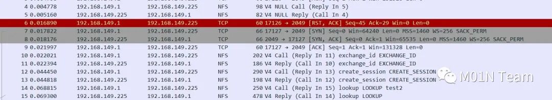 查询使用Nfs4SvrXdrpDecode_STRING进行解析的结构,发现凡是涉及到utf8strings传入的结构解析都可以触发,那么首先我们需要伪造一个NFSV4.1中的一个客户端与其通信,构造如下通信流程,获取打开文件必备的FILEHANDLE,