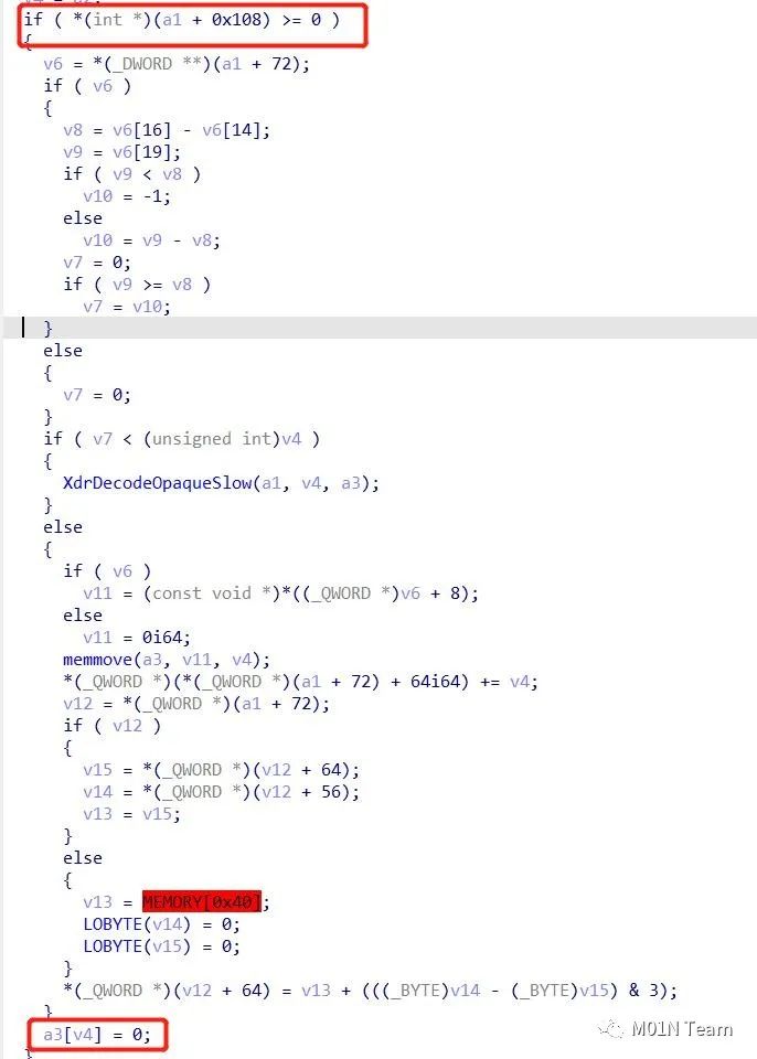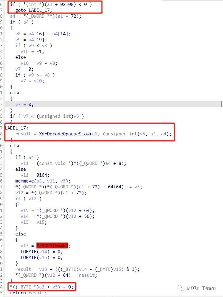 可以看出,仅当在(a1+0x108)指向的值大于等于0时,才会做下面一系列的操作,也就是说,在(a1+0x108)小于0时,代表程序已经出现错误,本该进入异常流程,但是还是跑去执行了XdrDecodeOpaqueSlow函数,并且有关键的写入操作。