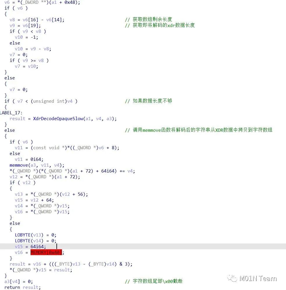 发现具体执行逻辑为,如果(a1+0x108)指向的值小于0后,跳转到LABEL_17执行XdrDecodeOpaqueSlow函数执行后,将(a3+v5)指向的值写0,而更新后的执行逻辑如下。