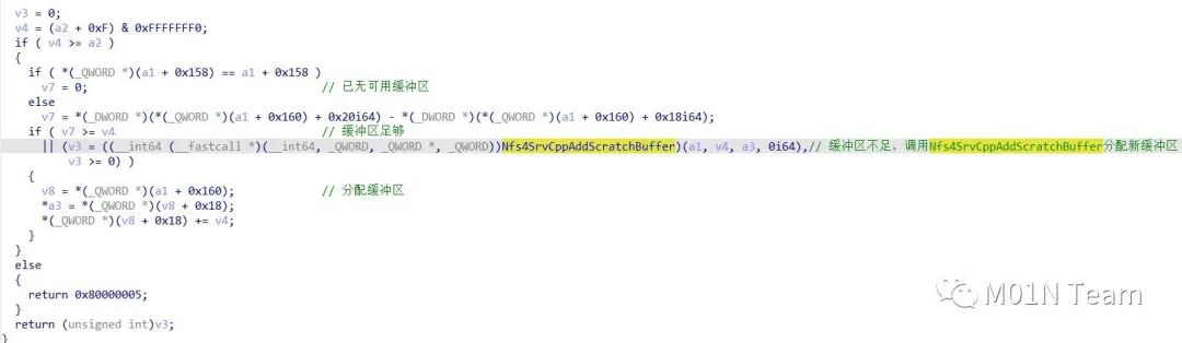 查看Nfs4SrvCpGetScratchBuffer函数,其功能为根据传入的大小计算缓冲区的大小(按照16字节对齐),检查是否需要分配新的缓冲区,如果需要则调用Nfs4SrvCppAddScratchBuffer函数来添加缓冲区,而Nfs4SrvCppAddScratchBuffer函数则是根据给定的大小分配内存,并与链表相连接,形成带有头结点的链表。