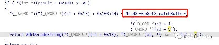 这里我们就会发现,我们要探索的a3为一个字符串数组,寻找其交叉引用,在Nfs4SvrXdrpDecode_STRING函数中,我们发现a3在Nfs4SrvCpGetScratchBuffer中被赋值,