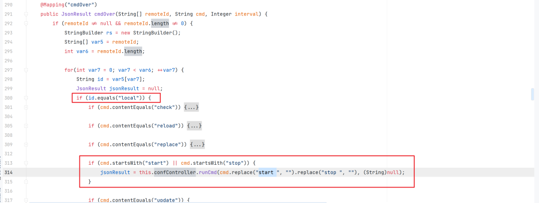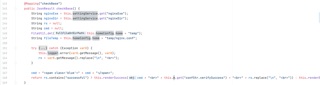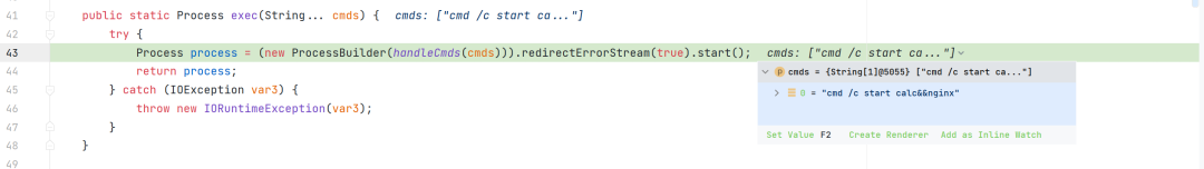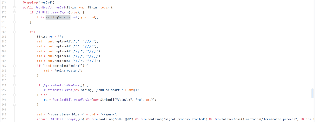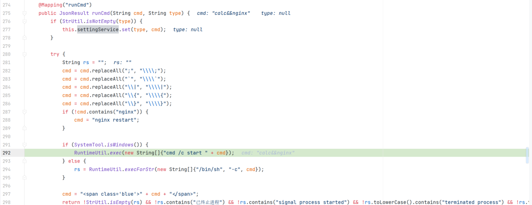 当到达函数 runCmd 时 cmd 参数可控,进行了一部分校验和过滤 只有cmd 中存在字符串 nginx 才可以继续执行,利用 && 来实现命令的拼接