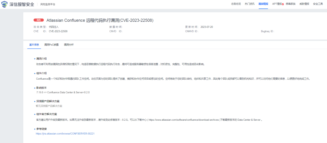 2023年7月19日,深信服安全团队监测到一则Atlassian Confluence组件存在远程代码执行漏洞的信息,漏洞编号:CVE-2023-22508,漏洞威胁等级:高危。