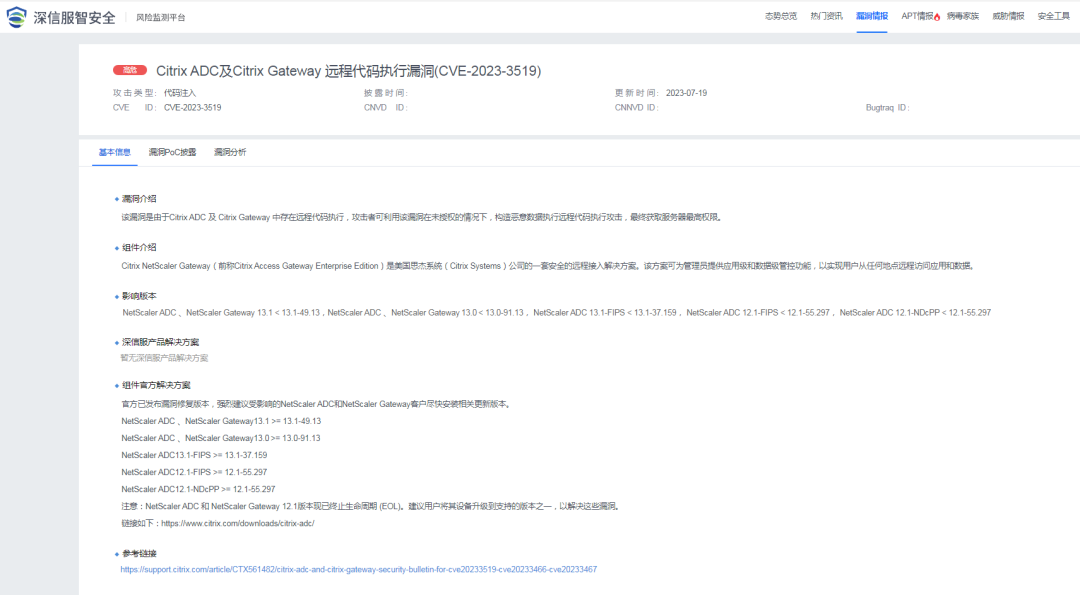 2023年7月19日,深信服安全团队监测到一则Citrix ADC、Citrix Gateway组件存在远程代码执行漏洞的信息,漏洞编号:CVE-2023-3519,漏洞威胁等级:高危。