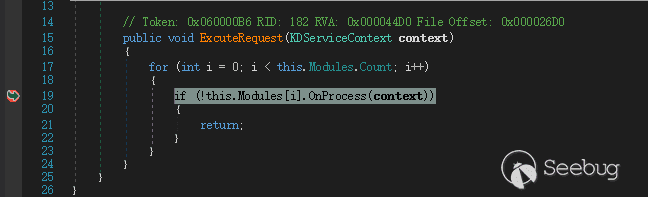 图15 寻找对应方法继续跟进,最终到达了 ExcuteRequest 方法内部,这里通过遍历几个 Modules 来处理这个请求,如图 16 所示。