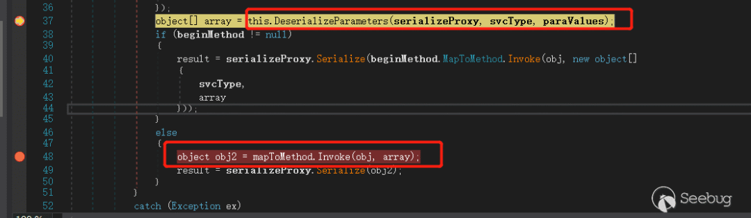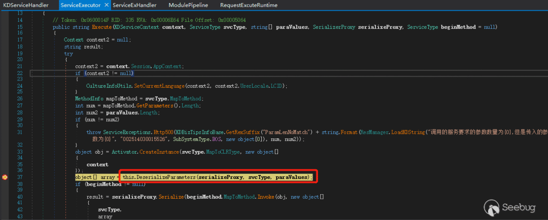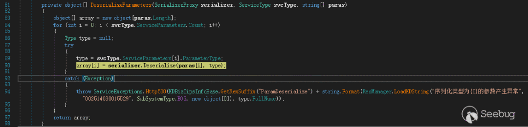 分析到反序列化执行点发现,这里是先进行反序列化,之后 Invoke 再执行方法内部再进行参数类型判断。这就意味着不管调用哪个类或者方法,只要该类或者方法存在并且可以传入值(至少一个),那么都会调用到 this.DeserializeParameters(serializeProxy, svcType, paraValues) 代码里面,如图 25 所示。