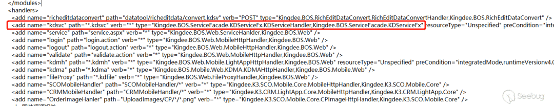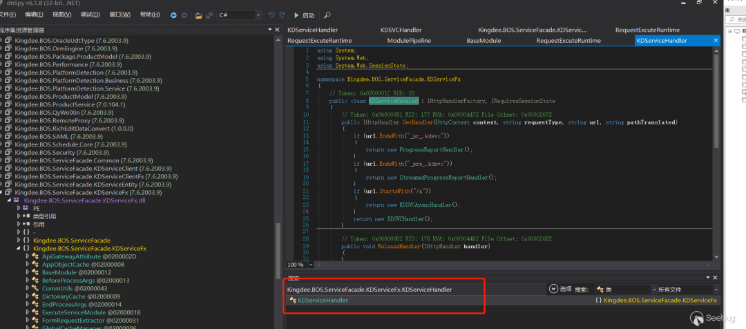 在 Web.config 的 handlers 中可以看到,其中定义了让路径为 kdsvc 结尾的请求去使用 Kingdee.BOS.ServiceFacade.KDServiceFx.KDServiceHandler 类进行处理,所以接下来寻找一下这个类的代码所在位置,如图 4 所示。