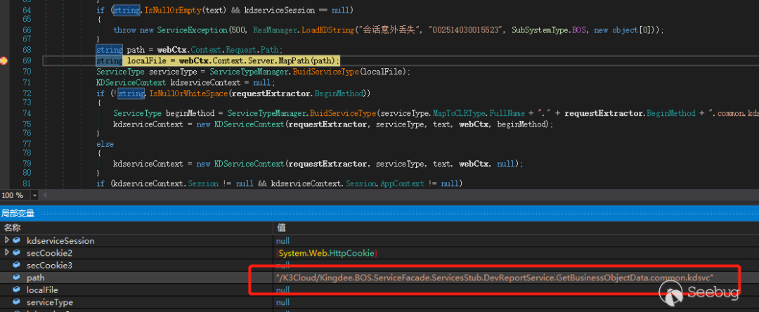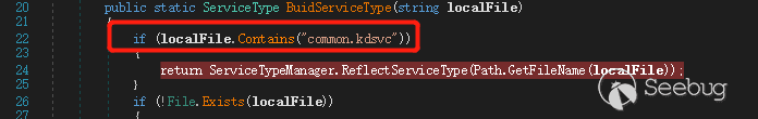 这里的 path 就为我们传递的 url ,然后通过 webCtx.Context.Server.MapPath(path); 生成一个 localFile,BuidServiceType 方法根据 localFile 包含common.kdsvc,继续跳转到其他逻辑,如图 13 所示。