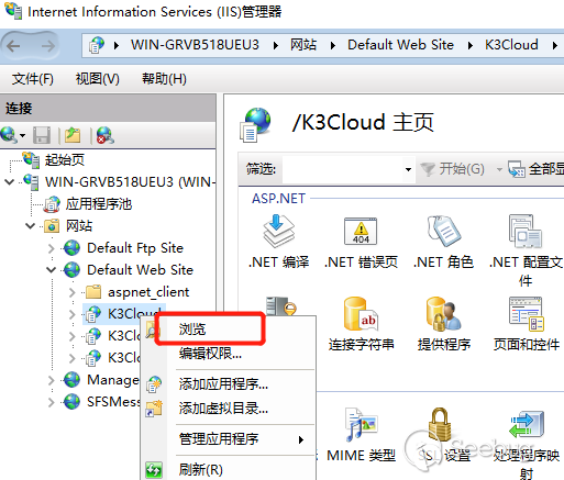 这是一个 .NET 程序,所以直接打开 IIS 管理器,右击 K3Cloud—— 浏览,找到源码的位置,如图 2 所示。