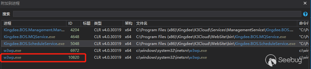 接下来将这个目录下的 Kingdee.BOS.ServiceFacade.KDServiceFx.dll 文件加载到 dnsPy 中,调试——>附加到进程,选择刚刚得到的进程号 ID,如图 9 所示。