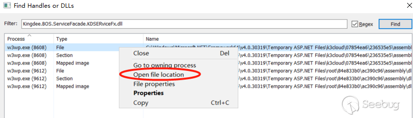 根据搜索已经知晓了是哪一个 dll 文件处理了(Kingdee.BOS.ServiceFacade.KDServiceFx.dll),接下来使用 Process Hacker 定位到该 dll 被调用时所在的位置,然后右击 Open file location。