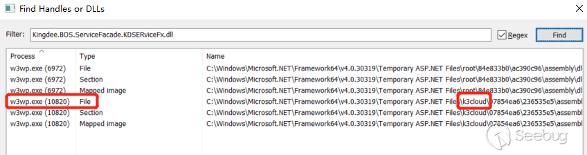 这一步有一个小坑,要先访问一遍漏洞路径,不然 Process Hacker 只能搜索出一个,并且这一个不能正确的进行调试。搜索出两个则选择包含 k3cloud 路径的那一个,如图 6。