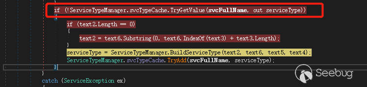 通过处理赋值给 text 提取出类名和方法名等,再先通过缓存去查找类,没找到再调用 BuildServiceType 方法,如图 14 所示。