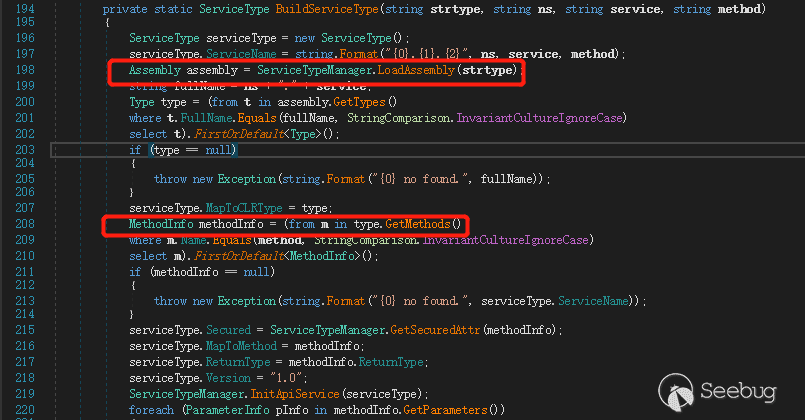 BuildServiceType 方法就是根据 strtype 定位到具体的程序集,然后再在程序集中寻找对应的类和方法等,如图 15 ,这里就不再细说。