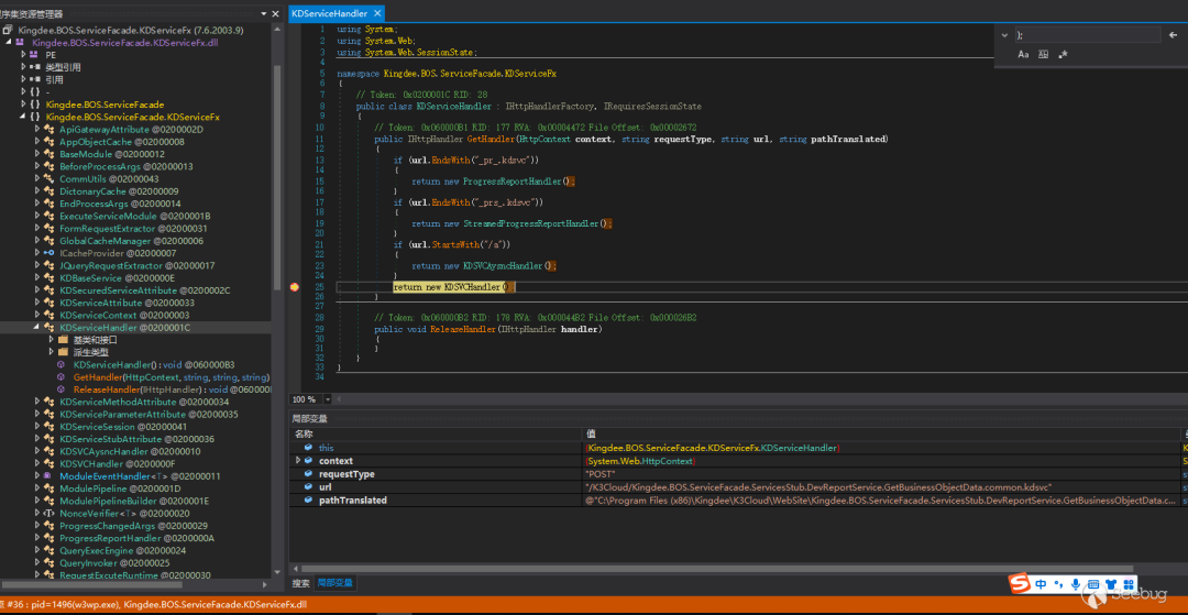 接下来在 Kingdee.BOS.ServiceFacade.KDServiceFx的KDServiceHandler 中打上断点,稍等几秒看见断点变为实心红圈表示可以调试了,如图 10 所示。