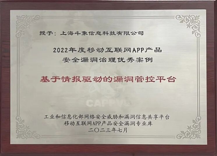 本次入选优秀案例是CAPPVD漏洞库对斗象科技在推动APP漏洞全链路治理平台建设,提升业务系统的稳定性及连续性能力的认可与肯定。斗象科技将继续携手工业和信息化部网络安全管理局、中国软件评测中心(工业和信息化部软件与集成电路促进中心)、工业和信息化部移动互联网APP产品安全漏洞专业库(CAPPVD漏洞库),在APP漏洞挖掘及漏洞管理上贡献力量,为移动互联网APP安全领域发展发挥关键作用,继续为网络安全保驾护航。