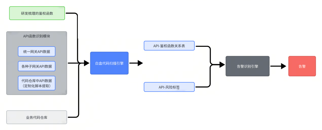 开发一个整合各方业务的数据,来判断API是否为告警的系统。该系统通过识别API该不该鉴权,有没有调用鉴权函数,有没有调对鉴权函数来判断API是否有越权风险。注意这里的几个关键词:第一,该不该鉴,这代表系统需要有语义分析能力,分析API是否是公共接口或者无需鉴权接口。第二,有没有调,系统需要知道所有的鉴权函数数据。第三、有没有鉴对,系统在有API鉴权数据后应该有规则校验API该调哪些鉴权函数,防止鉴权不完整(比如应该调用A,B两个鉴权函数,但实际只调了A鉴权函数)导致越权漏洞发生。