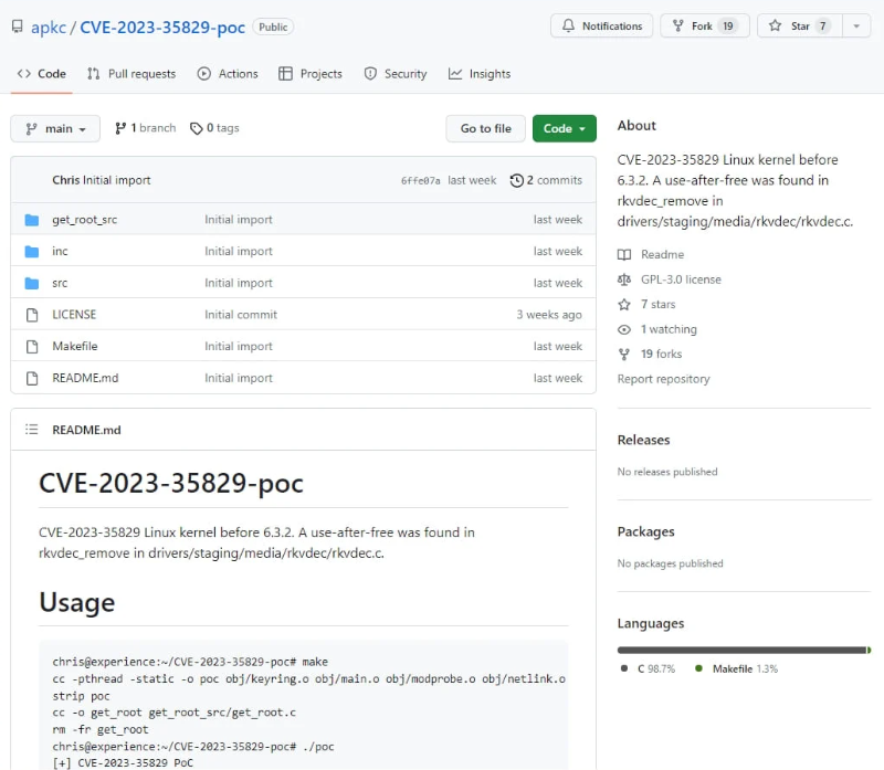 CVE-2023-35829是一个高位的释放后使用漏洞,影响Linux kernel 6.3.2及之前版本。该虚假PoC声称是CVE-2023-35829的漏洞利用代码。而事实上该虚假PoC只是CVE-2022-34918漏洞利用代码的一个副本。