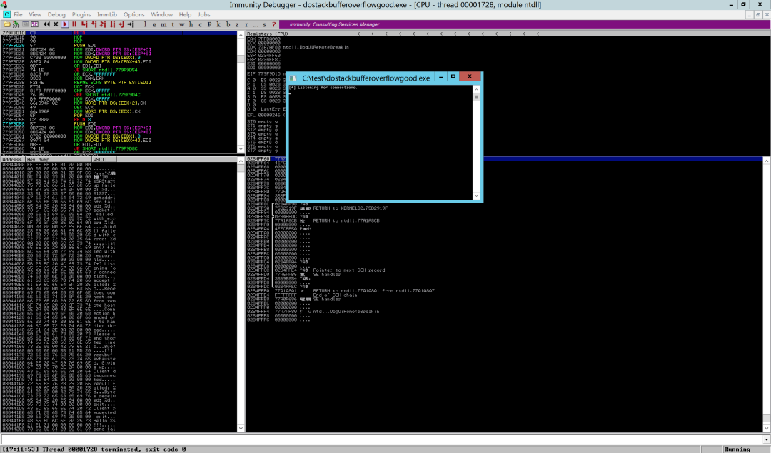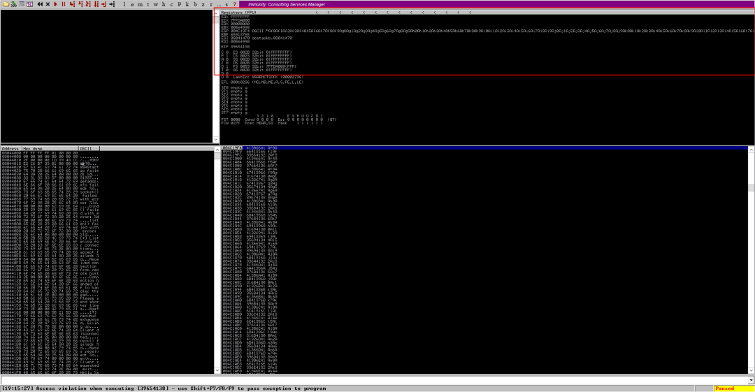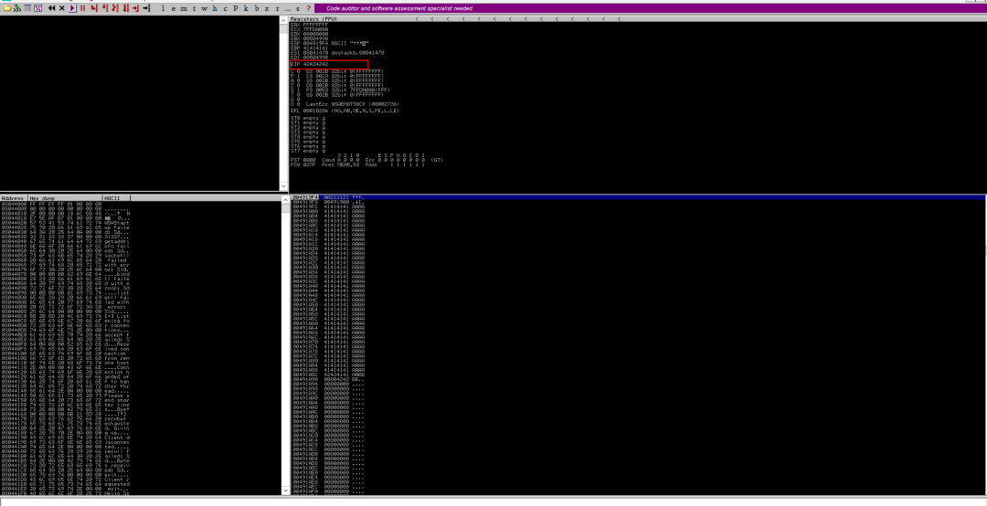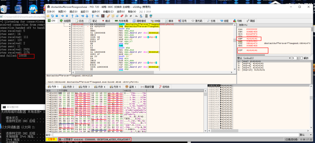 启动OD,加载程序,步进到程序运行的地方,我们在kali中开始nc并发送一堆A,然后程序抛出异常,且EBP和EIP已经全部变成了