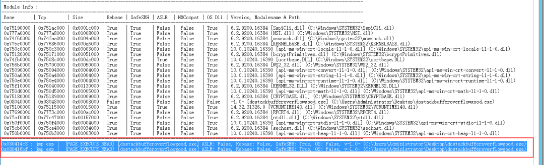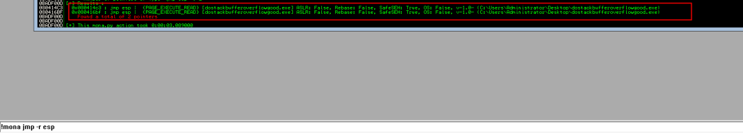 0x080414c3 : jmp esp | {PAGE_EXECUTE_READ} [dostackbufferoverflowgood.exe] ASLR: False, Rebase: False, SafeSEH: True, OS: False, v-1.0- (C:\Users\Administrator\Desktop\dostackbufferoverflowgood.exe)