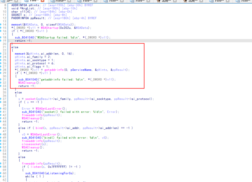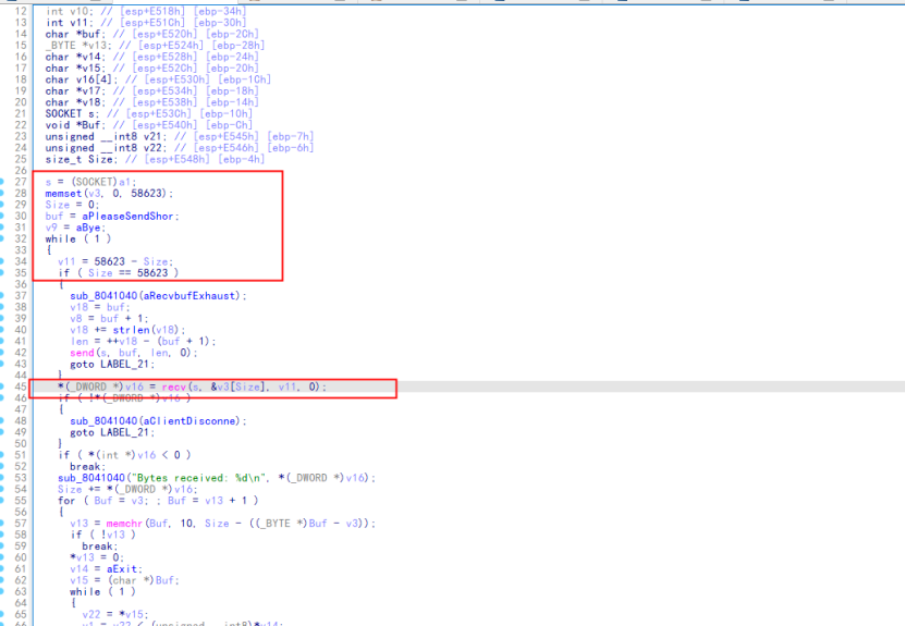 继续往下看,有了端口,那么就该找一下在建立连接后接受发送相关的代码或者函数了,那么如下图所示,这段代码整体来讲就是用来接收和处理套接字数据,但是根据接收的内容然后去执行相对应的操作,但是这并非重点,重点在于红框内的内容,即定义的缓冲区大小为