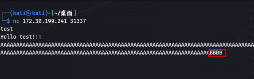 那么在此之前,我想用字符去确认一下偏移量是否准确,我们使用146个A,然后再使用4个B,看下EIP被覆盖的情况。