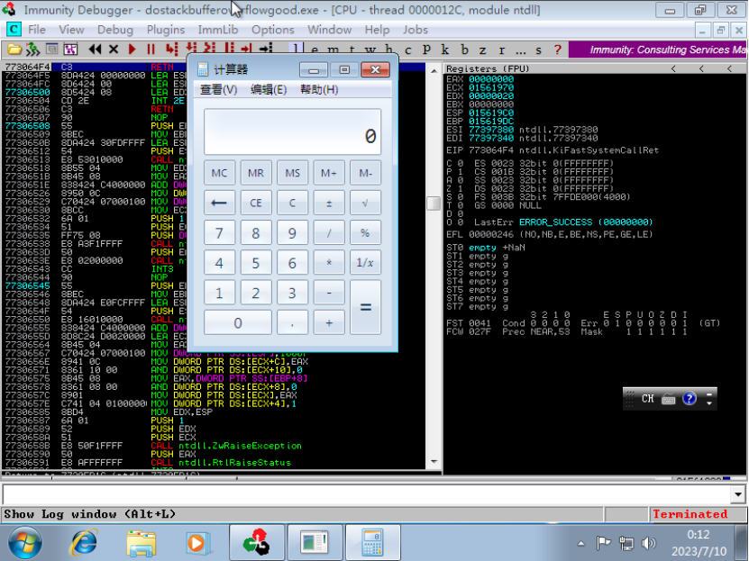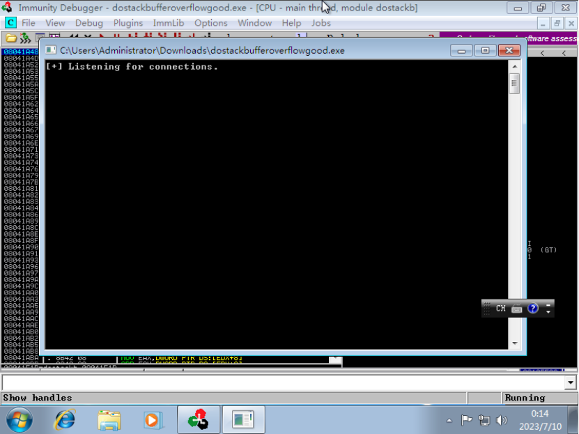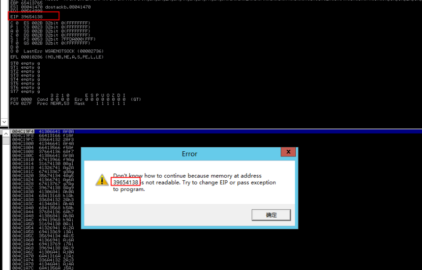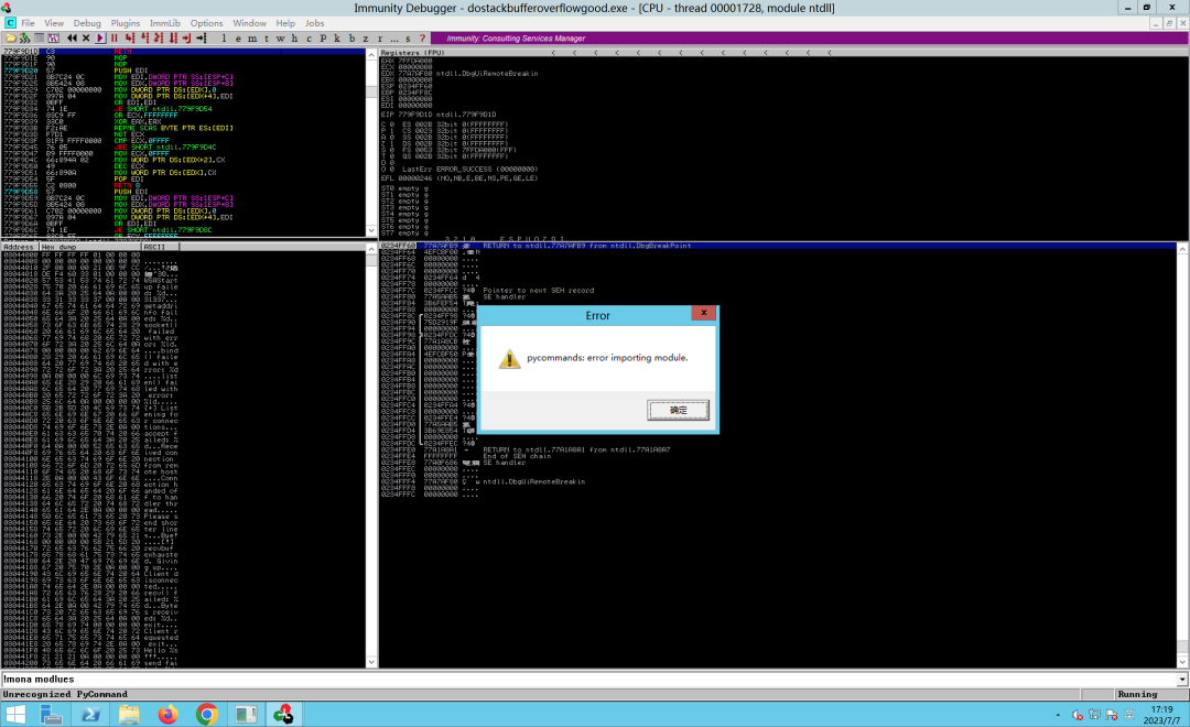 程序成功崩溃,但是不确定是不是溢出导致的,所以图方便我们可以使用OD看下它是怎么个事儿(但是我虚拟机网络有点问题,我同时使用了好几台虚拟机配合着来的,现在换一个有OD的环境)