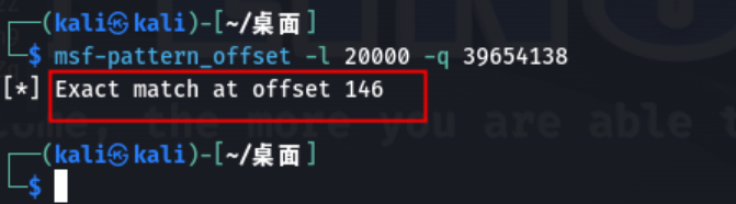原理就是先生成20000个字符用于发送至服务端,然后根据溢出时EIP被覆盖的数据用来计算一共被覆盖了多少位;显示结果为146,说明覆盖EIP地址的是第146个字符后面的字符,接下来就可以控制EIP的地址,需要让他跳转到我们的shellcode。(早知道146个字符它就顶不住了,我又何必使用20000个字符去折磨它呢?对不起我不知道你这么脆弱)