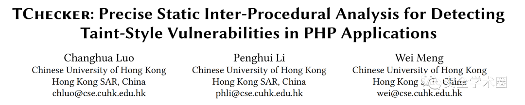 原文标题:TChecker: Precise Static Inter-Procedural Analysis for Detecting Taint-Style Vulnerabilities in PHP Applications原文作者:Chenghua Luo, Penghui Li, Wei Meng原文链接:https://www.cse.cuhk.edu.hk/~wei/papers/ccs22_tchecker.pdf笔记作者:1cey@安全学术圈编辑:黄诚@安全学术圈