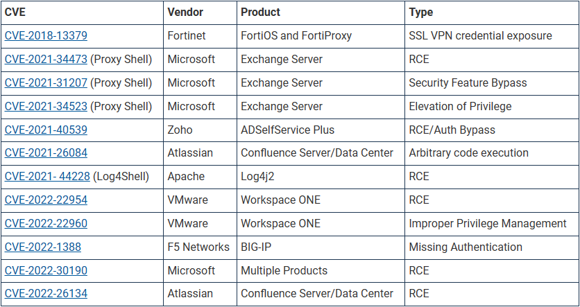 8月3日,美国网络安全与基础设施安全局CISA、国家安全局NSA和联邦调查局FBI,联合五眼联盟的其他各国网络安全机构,公布了2022年最常被利用的top 12漏洞。