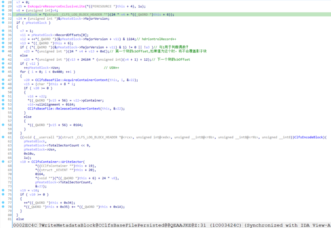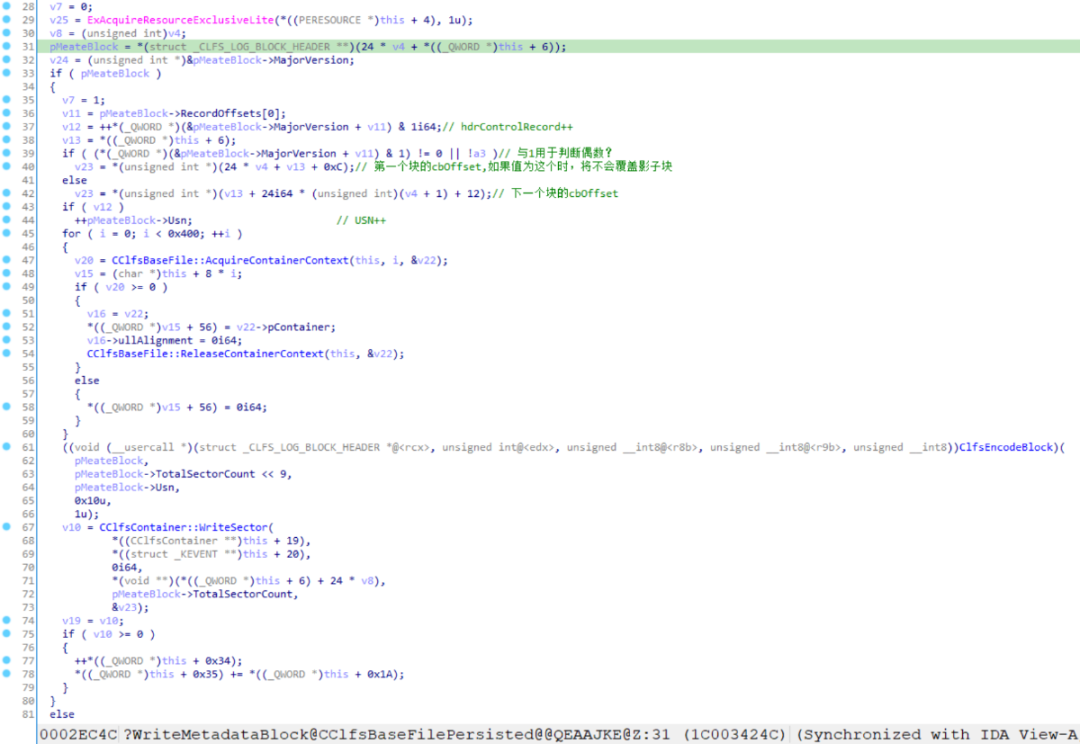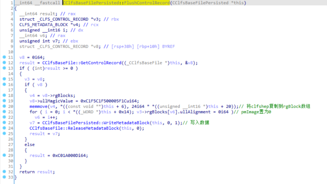 FlushControlRecord函数在处理部分数据后,于23行调用了CClfsBaseFilePersisted::WriteMetadataBlock。
