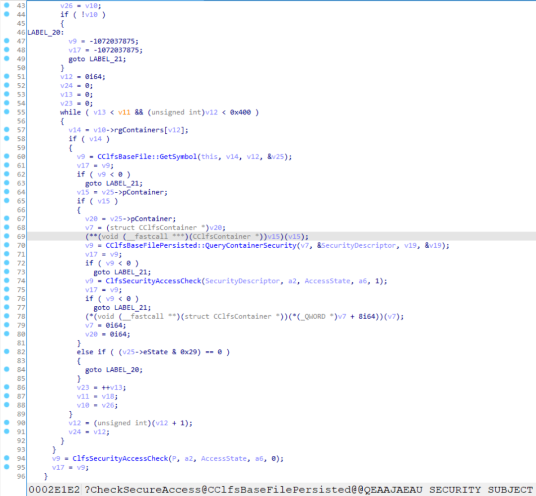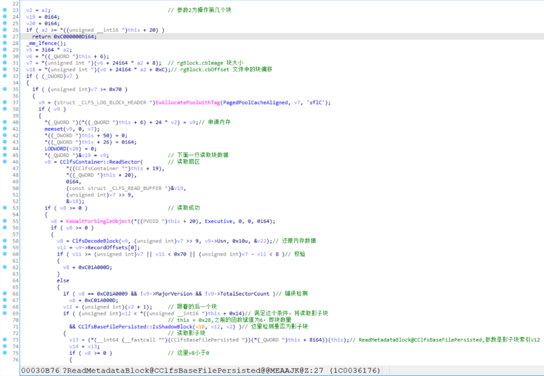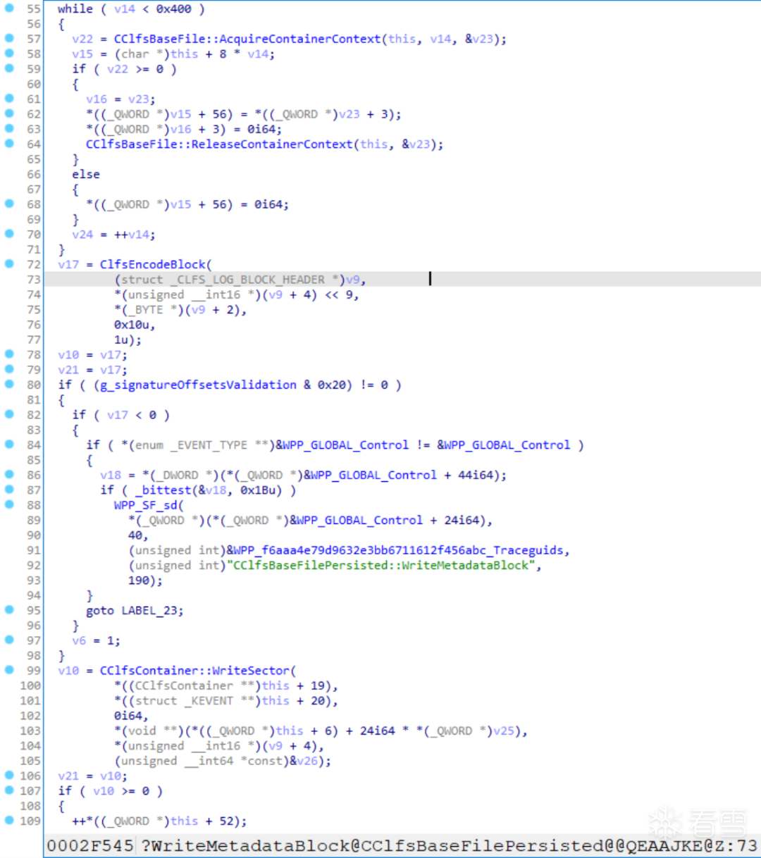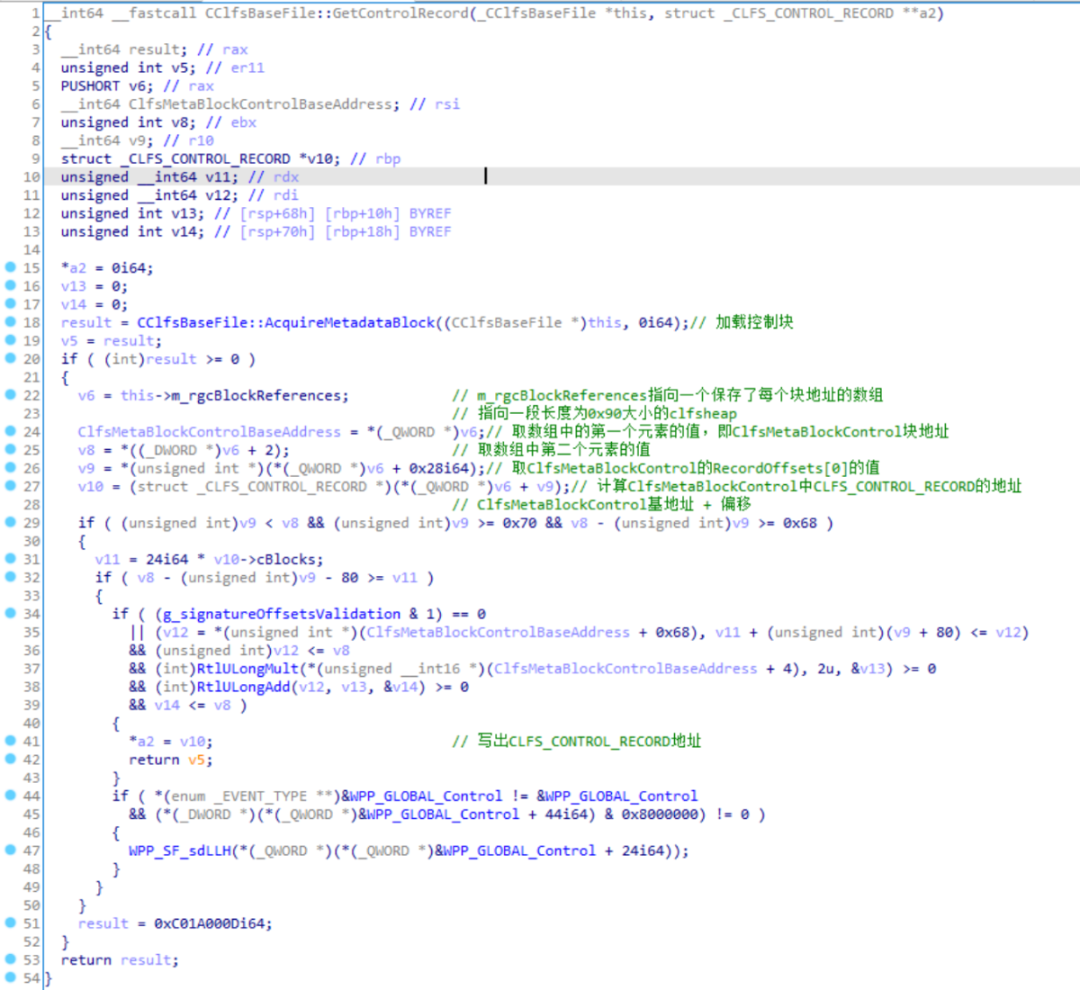 GetControlRecord函数18行调用CClfsBaseFile::AcquireMetadataBlock函数加载ClfsMetaBlockControl块,随后进行一系列检查,最终将ClfsMetaBlockControl中CLFS_CONTROL_RECORD的地址写入到参数2。