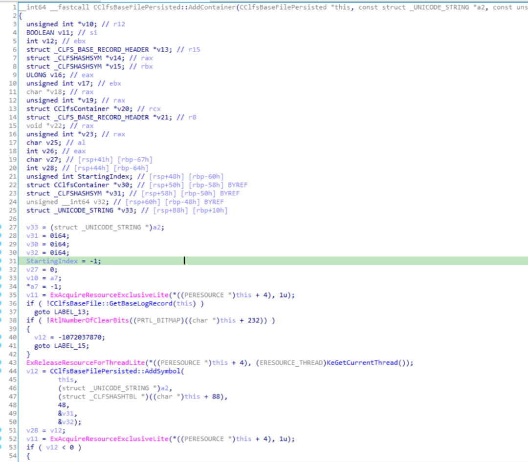 漏洞通过 CreateLogFile和AddLogContainer 函数进行触发,接下来将根据构造的日志文件内容梳理这两个函数的执行流程。为了便于理解clfs.sys的函数,首先将ionescu007文章中的CLFS相关结构体整理成了头文件,并加载到IDA中。